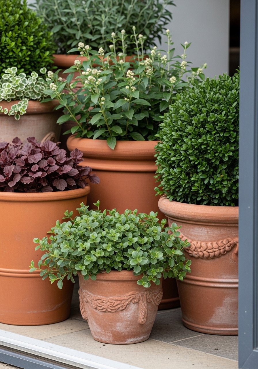 I group terracotta pots at different heights and sizes, then add a boxwood topiary for structure. The warm clay and evergreen shape give the courtyard that French restraint. Visually the pots create depth and a soft edge to hard paving. One insight: repetition matters more than variety—repeat the same pot or plant to read as deliberate. A common mistake is scattering many unmatched pots; it reads cluttered rather than curated.