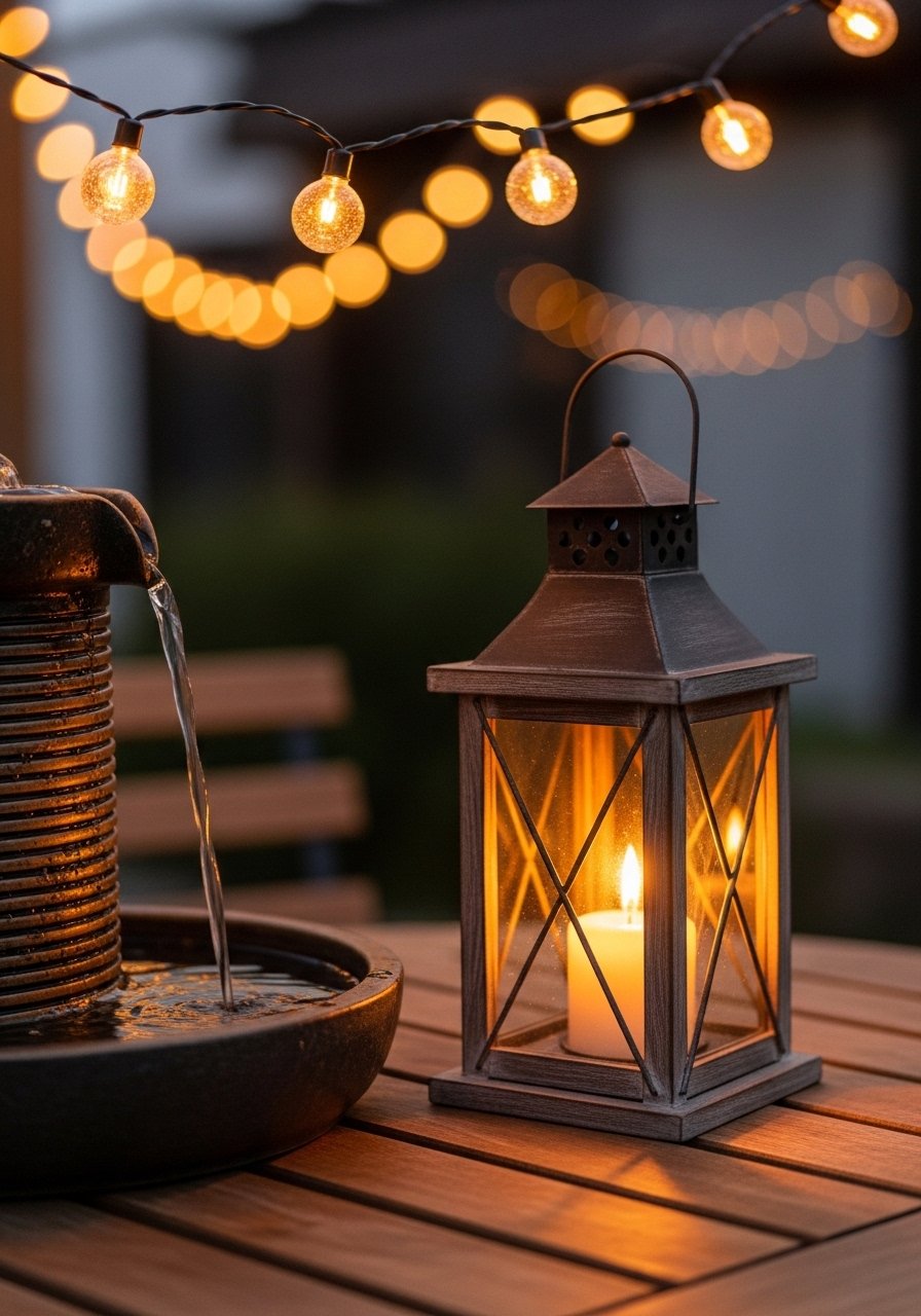 I finish with warm string lights, a tabletop lantern, and a small fountain or water bowl. Layered low light reads as intentional luxury. It softens shadows and makes the courtyard usable after dusk. One insight is that low, warm sources feel more luxurious than a single bright light. A mistake I see is relying only on overhead bulbs; they flatten texture and kill the cozy feel. Keep lighting dim and layered for a comfortable evening.